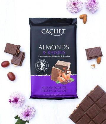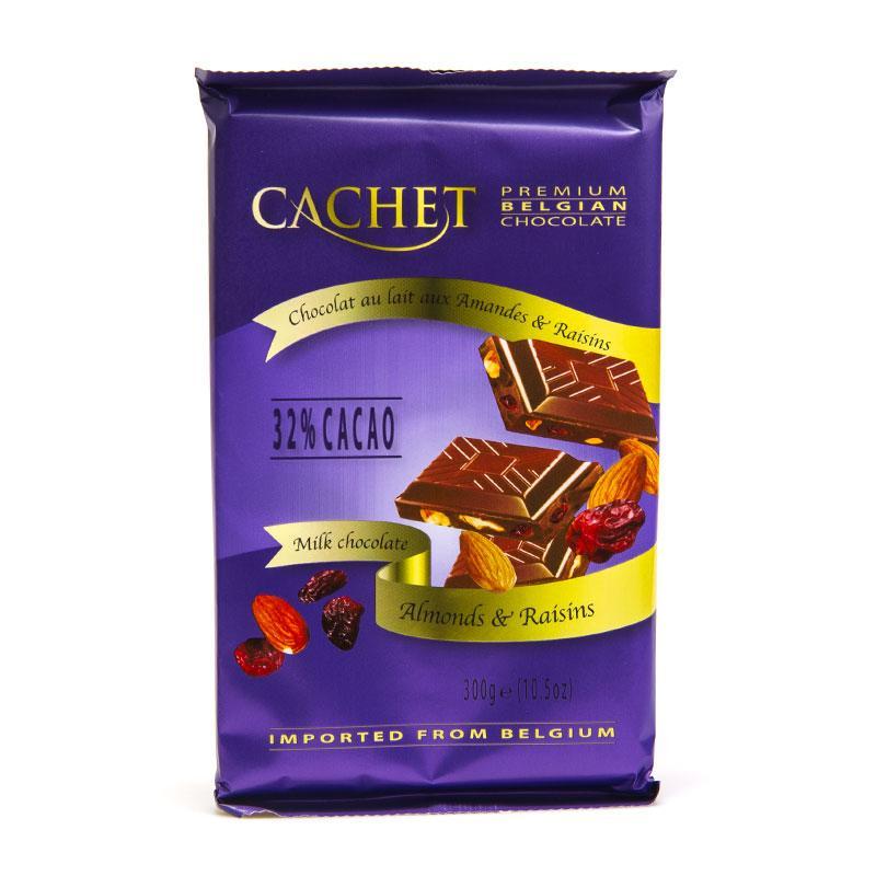 Cachet milk chocolate with almonds and raisins - бельгийский молочный шоколад с изюмом и миндалем. Изысканное лакомство, изящно сочетающее в себе вкус молочных сливок, аромат какао, изюм и хрустящий дробленный миндаль.